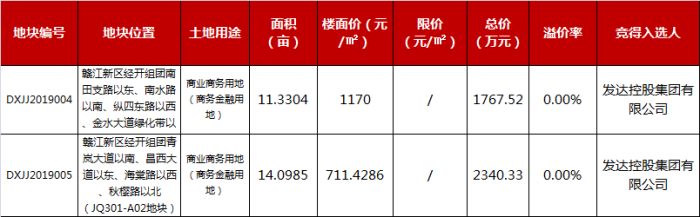 2019年4月19日10:04,發(fā)達(dá)控股集團(tuán)有限公司以底價(jià)成功競得地塊編號(hào)為"DXJJ2019004"和"DXJJ2019005"的贛江新區(qū)兩宗總部經(jīng)濟(jì)用地。