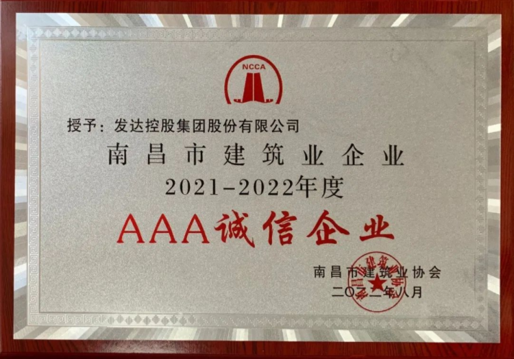 近日,從南昌市建筑業(yè)協(xié)會(huì)傳來(lái)喜訊,發(fā)達(dá)控股集團(tuán)喜獲市建筑業(yè)“2021-2022年度AAA誠(chéng)信企業(yè)”榮譽(yù)稱號(hào)。