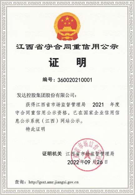 近日,江西省市場(chǎng)監(jiān)督管理局公布了2021年度江西省“守合同重信用”單位名單。發(fā)達(dá)控股集團(tuán)憑借良好的信用體系建設(shè)和誠(chéng)信履約形象榮登榜單,至此,集團(tuán)已連續(xù)多年獲此殊榮。