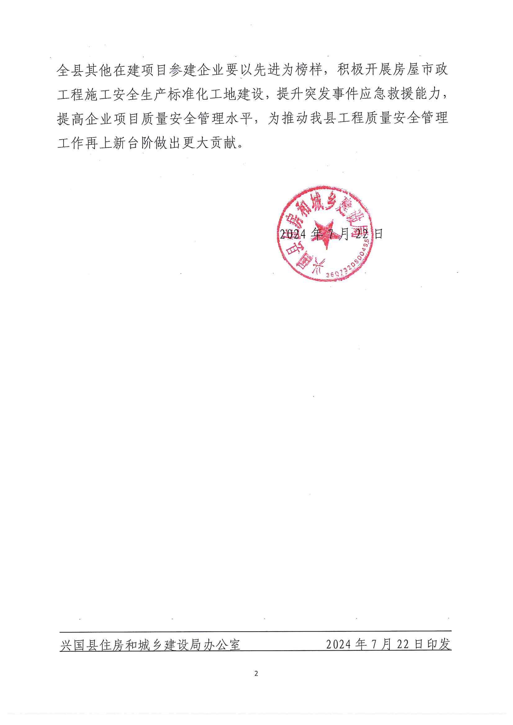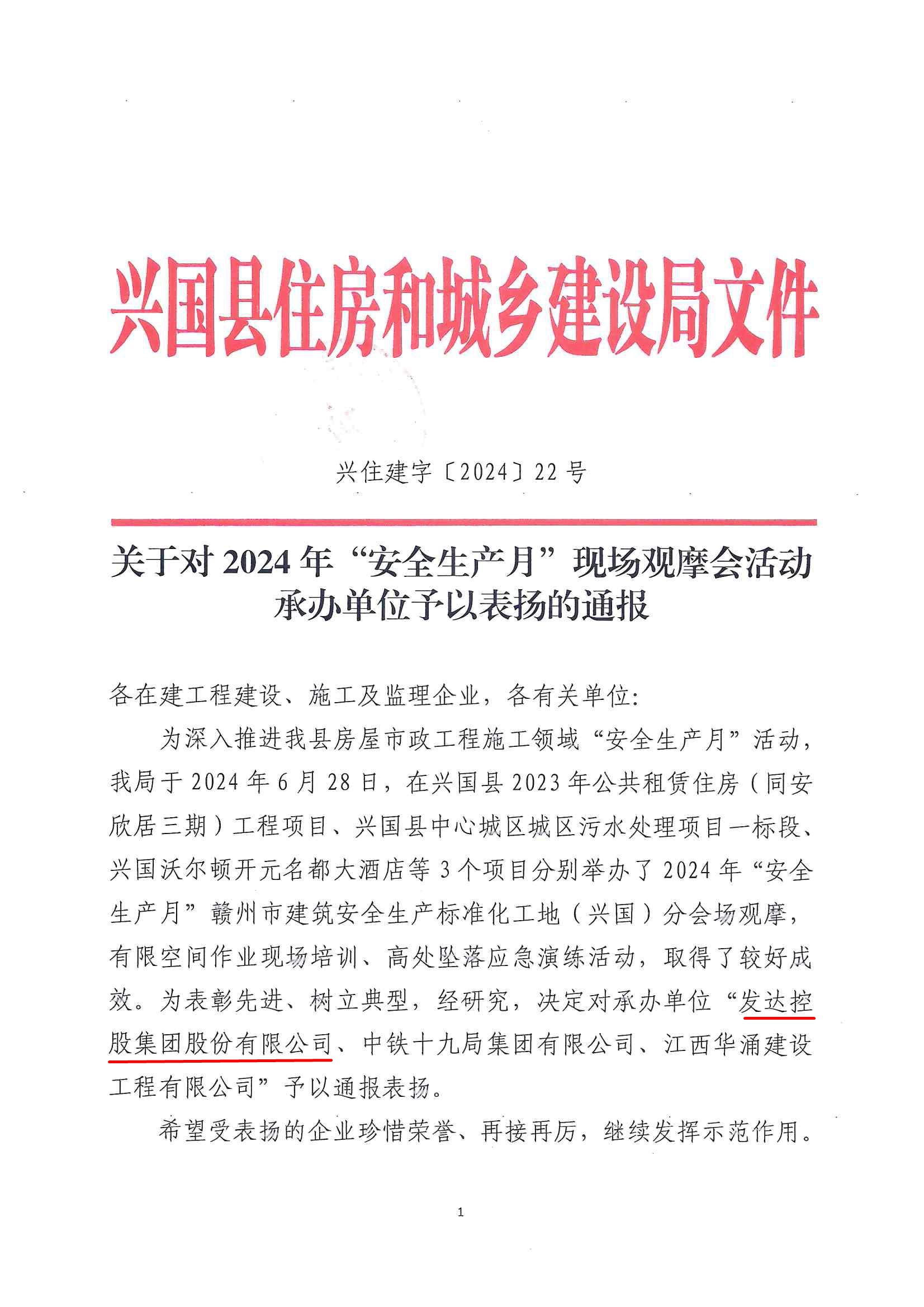 近日,興國縣住房和城鄉(xiāng)建設局對集團承辦2024年“安全生產月”贛州市建筑安全生產標準化工地(興國)分會場觀摩會予以通報表揚。